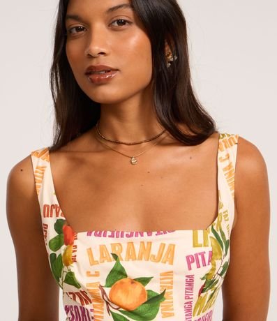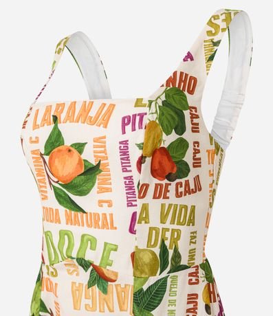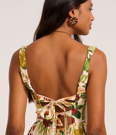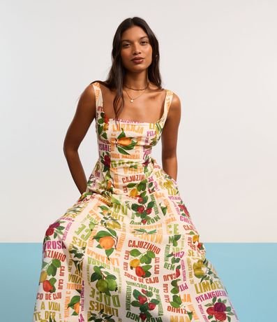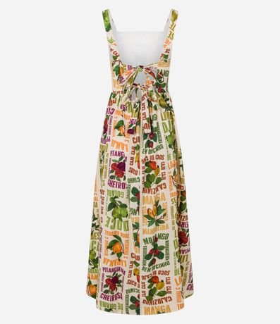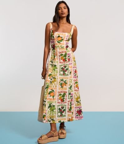 Ref: Vestido longo com alças largas, confeccionado em algodão bci mais sustentável, amarração nas costas e estampa tropical em repetição.