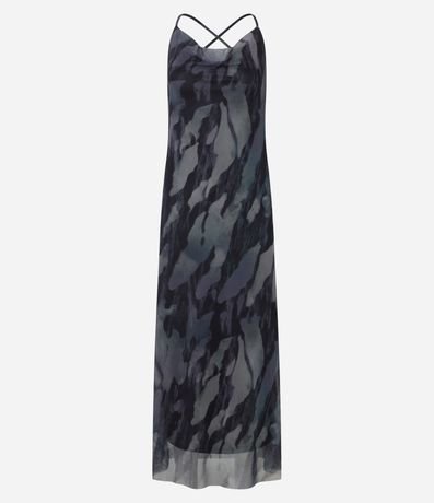 Vestido longo feminino confeccionado em tule, com decote degagê frontal e nas costas, alças finas e estampa abstrata. Possui alças cruzadas em X nas costas e amarração.