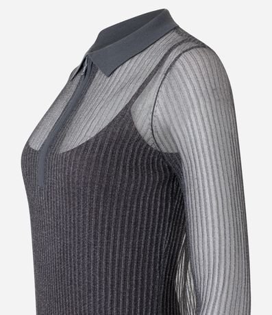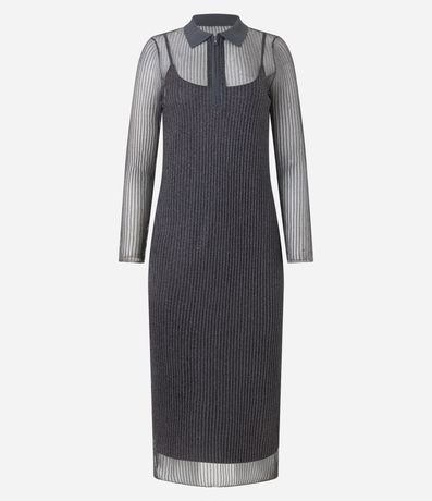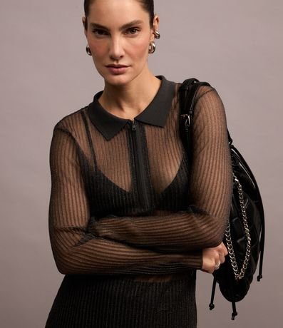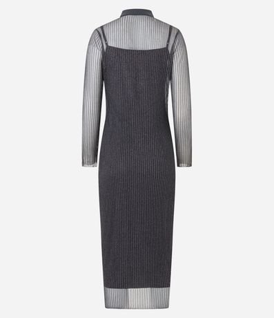 Ref: Vestido longo, confeccionado em tule metalizado, gola polo em retilínea e com zíper, manga loga, com transparência e forro com alcinhas.
