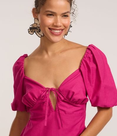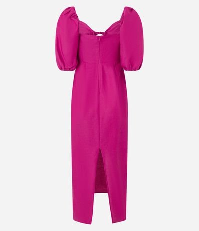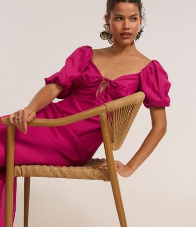 Vestido longo de viscolinho com caimento reto, mangas bufantes e busto franzido com amarração.