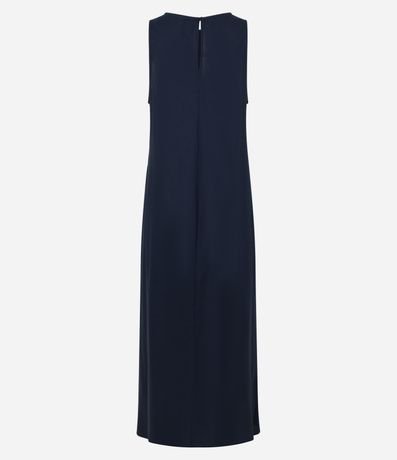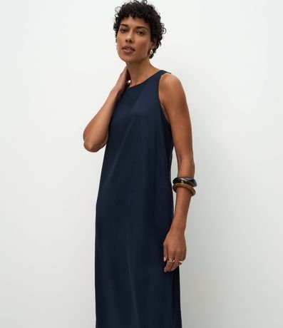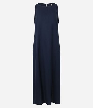 Ref: Vestido feminino longo em viscolinho confeccionado em viscose mais sustentável. Possui modelo sem mangas, com gola rente ao pescoço, modelagem alongada, bolso lateral e recorte na parte de trás.