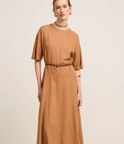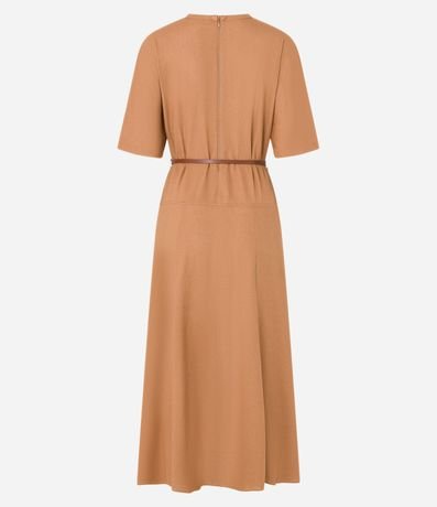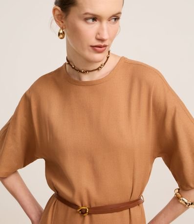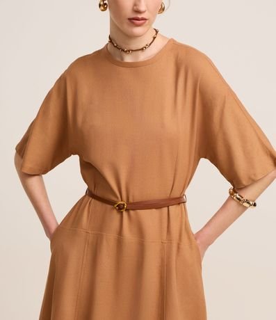 Ref: Vestido alongado de mangas curtas, confeccionado em viscolinho com 30% de linho, com gola redonda e fechamento por zíper nas costas. Inclui cinto estreito com fivela metalizada de formato com efeito martelado. Este produto possui viscose certificada em sua composição, além de ter sido produzido através de processos mais sustentáveis com boas práticas ambientais, sendo ambientalmente mais responsável.