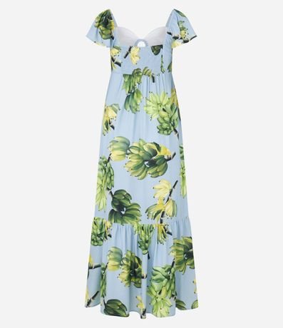 Ref: Vestido longo com manga curta, confeccionado viscose com estampa tropical floral. Possui lastex nas costas e babado na barra.