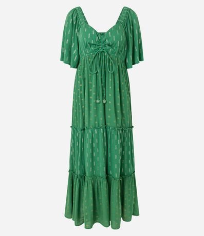 Ref: Vestido longo com manga curta soltinha, franzidinho e amarração no busto e confeccionado em viscose certificada mais sustentável. Possui elástico nos ombros, textura maquinetada e fio metalizado.