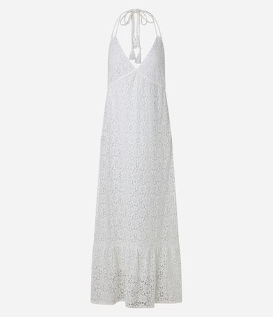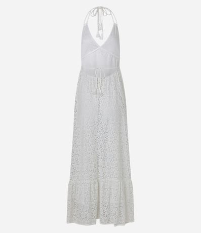 Ref: Vestido feminino confeccionado em renda de algodão certificado bci com frente única, amarração no pescoço, ponteiras com tássel, longo, decote em v e frente única.