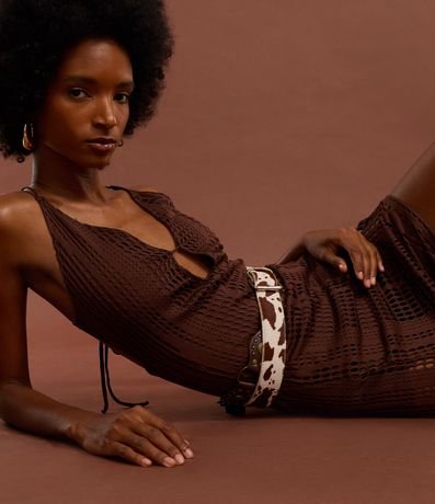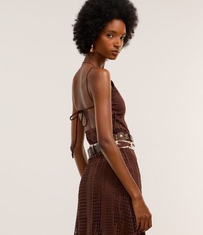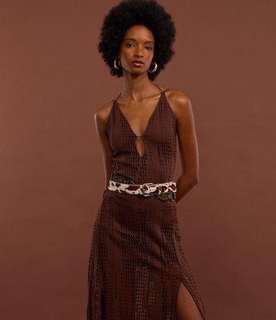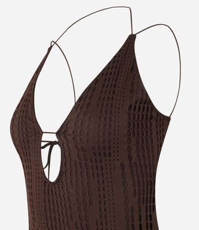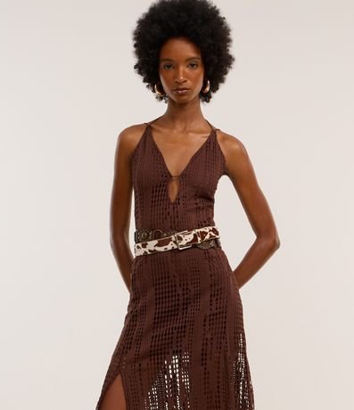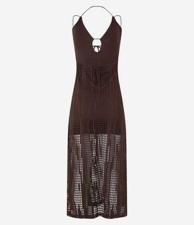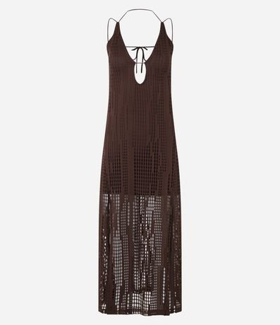 Ref: Vestido feminino de modelo longo, com decote frente única e confeccionado em malha de poliéster com elastano. Possui costas abertas, alcinhas finas e textura de furos com forro.