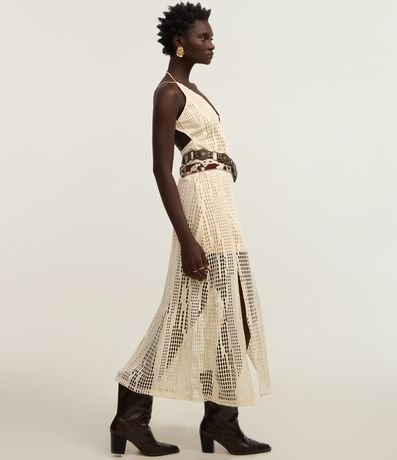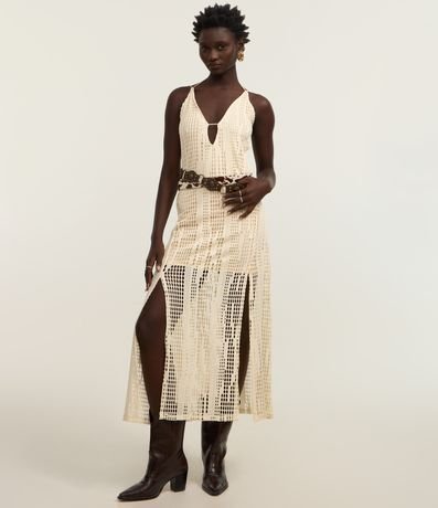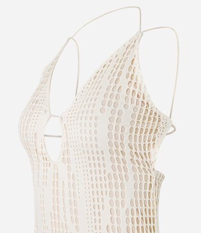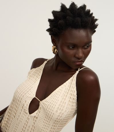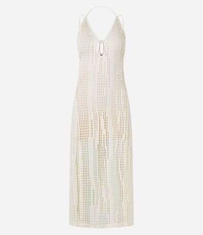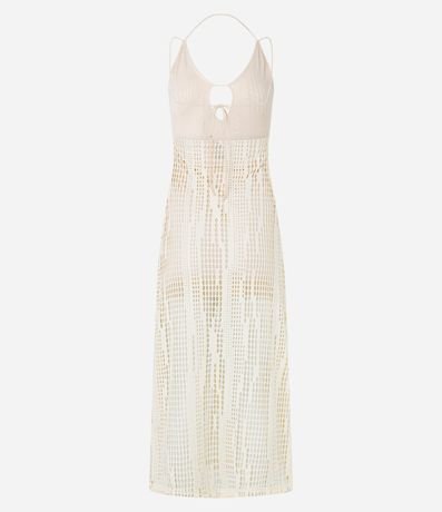 Ref: Vestido feminino de modelo longo, com decote frente única e confeccionado em malha de poliéster com elastano. Possui costas abertas, alcinhas finas e textura de furos com forro.