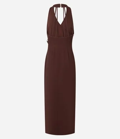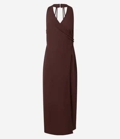 Vestido longo de frente única, confeccionado em poliéster, com decote v transpassado, alças finas, fechamento no pescoço, no modelo reto e alfaiatado.