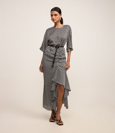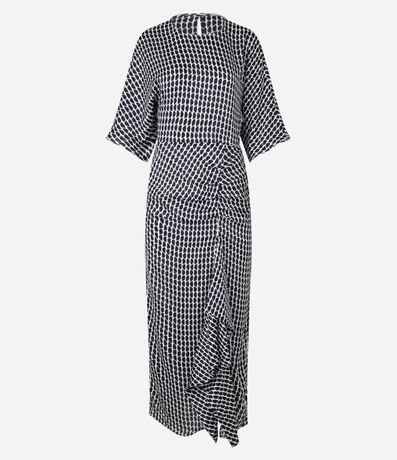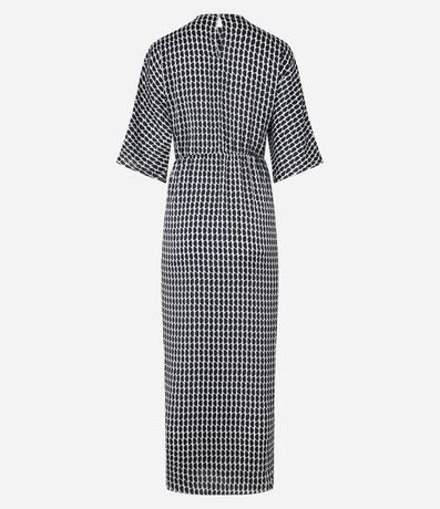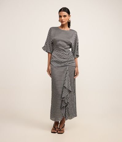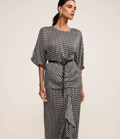 Vestido longo, reto com meia manga, confeccionado em chiffon. Possui estampa geométrica com elástico interno na cintura e babado frontal.