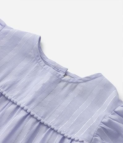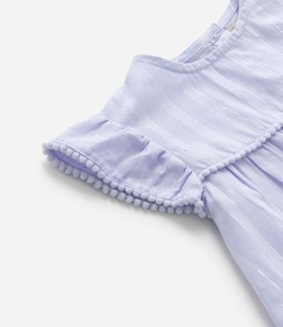 Vestido infantil de modelo marias, confeccionado em tricoline, com gola redonda, mangas curtas com babadinhos, detalhes em pompons e com fio metalizado na trama da peça.