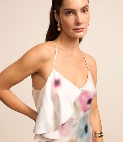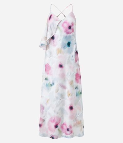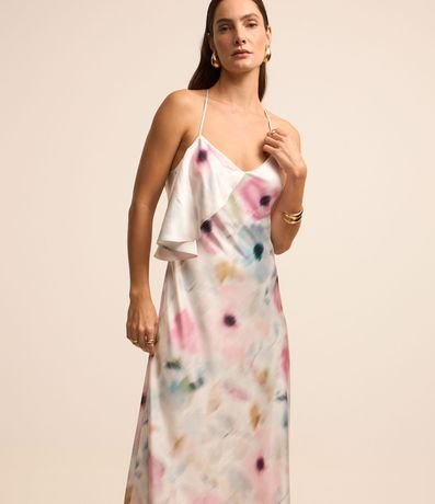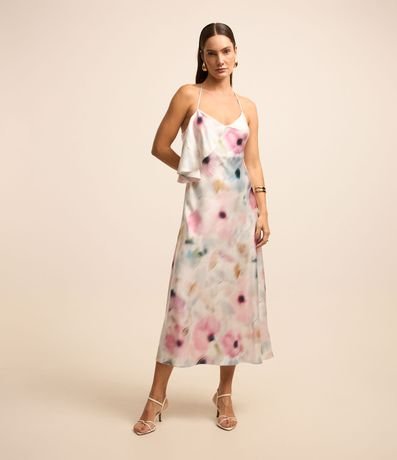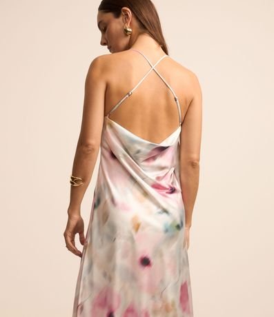 Vestido feminino de modelo midi, confeccionado em tecido de acabamento acetinado, com decote V e alças finas cruzadas nas costas. Possui estampa floral, detalhe de sobreposição no busto e decote degagê nas costas.