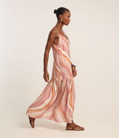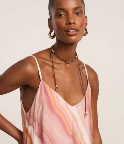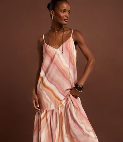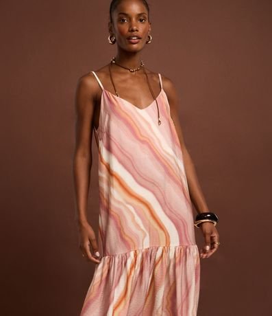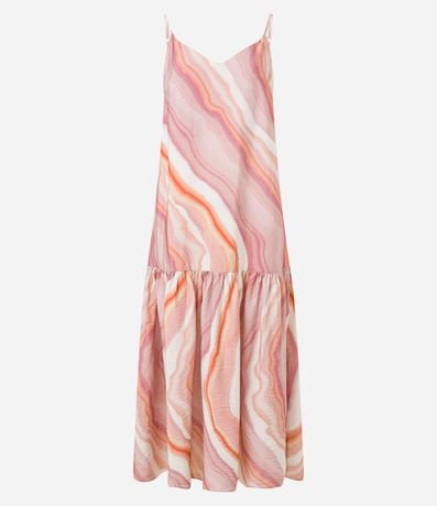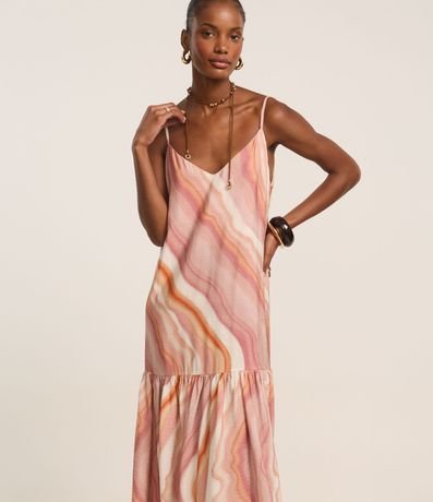 Vestido feminino confeccionado com viscose certificada. De modelo midi, possui alças finas, decote V, recorte na saia e estampa marmorizada.