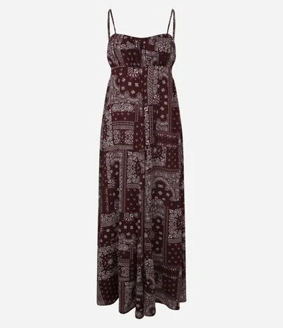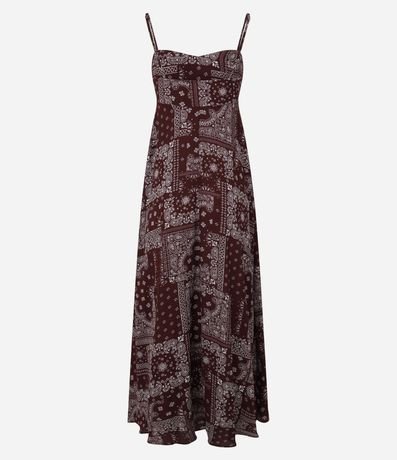 Ref: Vestido feminino midi em poliéster com estampa paisley. Possui alças finas ajustáveis, decote com recorte sutil, modelagem sem mangas, caimento solto ao longo do corpo e saia ampla.