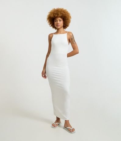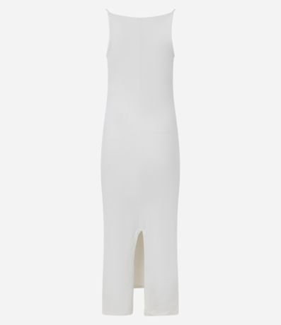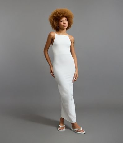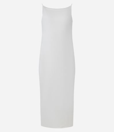 Ref: Vestido de modelo midi, confeccionado em material mais sustentável. Possui alças finas, decote reto e fenda traseira.