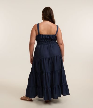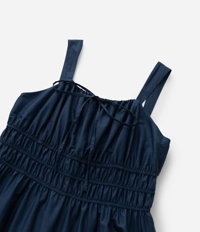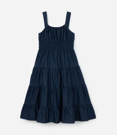 Ref: Vestido midi confeccionado em tricoline de algodão mais sustentável, sem estampa. A peça tem alças largas, lacinho no decote, bustro franzido, recorte elástico e babados maria na saia.