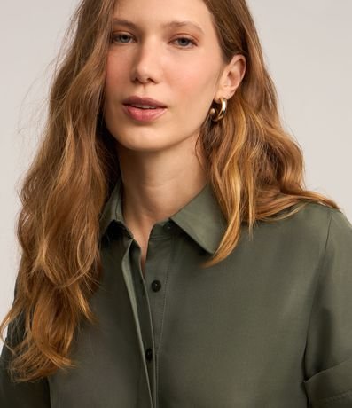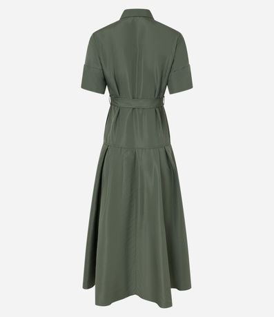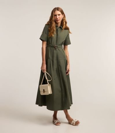 Ref: Vestido midi feminino, com gola lapela, mangas curtas com dobras, fechamento frontal, cinto fivela na cintura e recorte na altura do quadril.