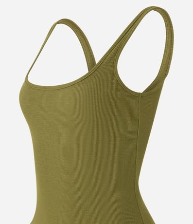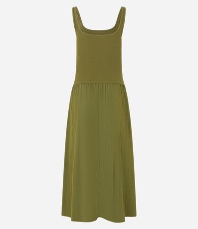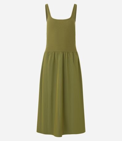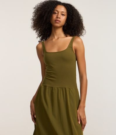 Ref: Vestido sem mangas e sem estampa. A peça é composta pelo corpo de ribana, ajustado ao corpo, e pela saia cadeirão em tecido plano, mais ampla.