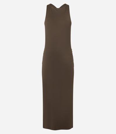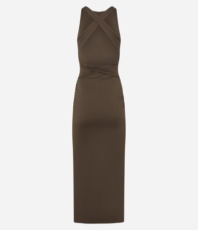 Ref: Vestido feminino confeccionado em poliamida com gola redonda, sem manga, alças largas cruzadas e costas abertas.