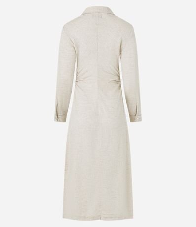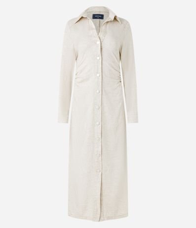Ref: Vestido midi de mangas longas confeccionado em jeans com colarinho na gola, abotoamento frontal e franzidos nas laterais.