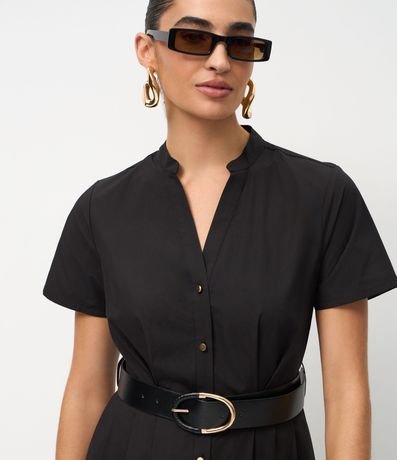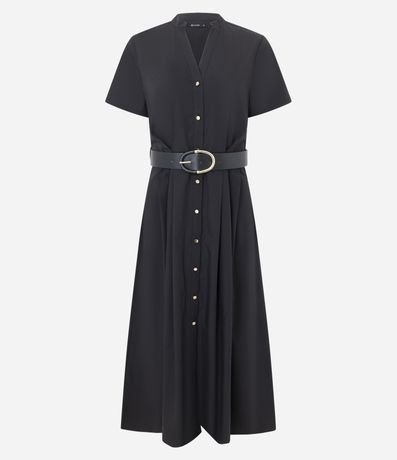 Vestido midi feminino confeccionado em algodão certificado BCI. Possui manga curta, com decote em V discreto e fileira frontal de botões. Apresenta modelagem acinturada destacada por um cinto largo preto com fivela oval metálica.