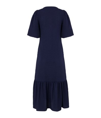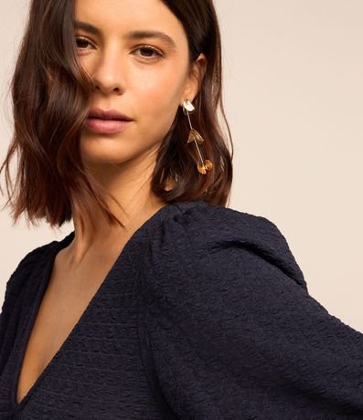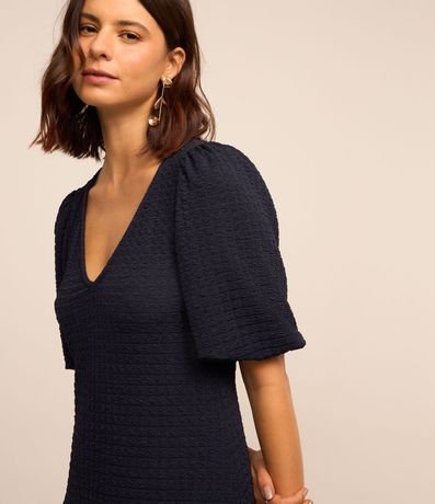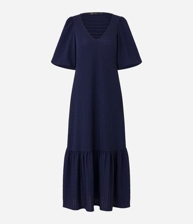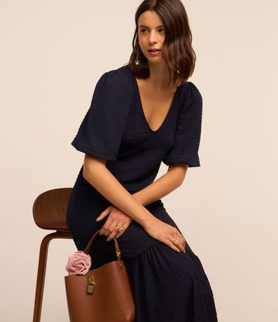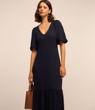 Vestido midi feminino, com decote V, mangas curtas, recorte franzido na barra e texturas.