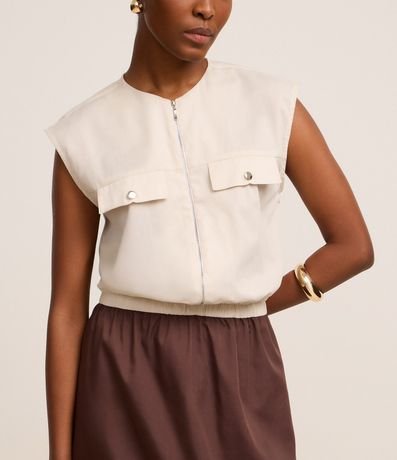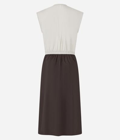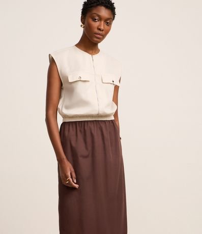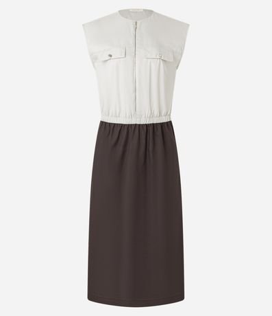 Ref: Vestido feminino confeccionado em tricoline com melhores práticas ambientais, peça com gola redonda, sem manga, abertura frontal por zíper, lapela com botão e cintura com elástico.