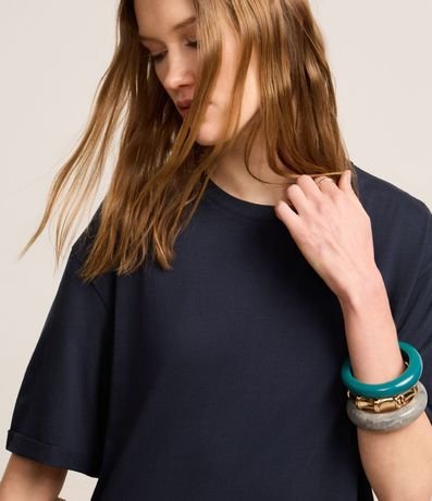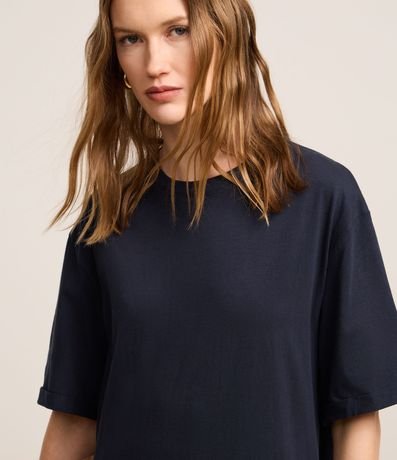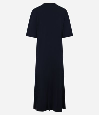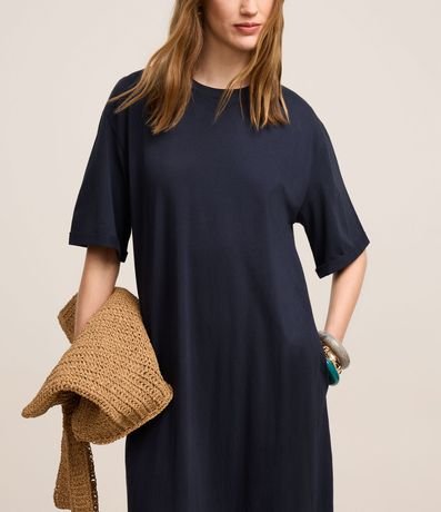 Vestido manga curta feminino confeccionado em malha de algodão, com gola redonda e sem estampa. Possui comprimento midi e mangas largas.
