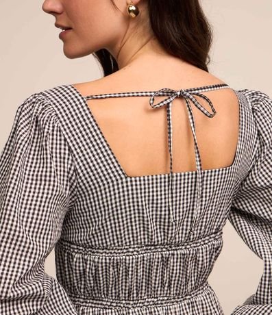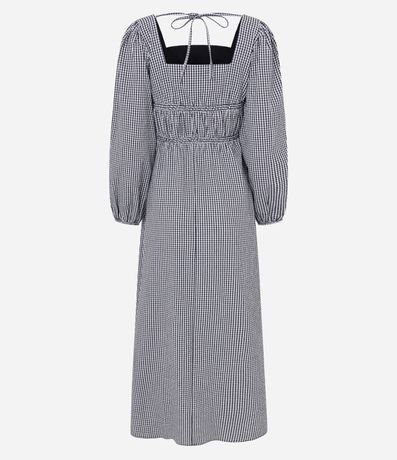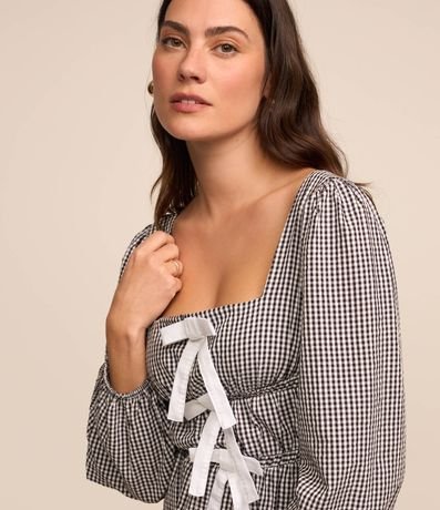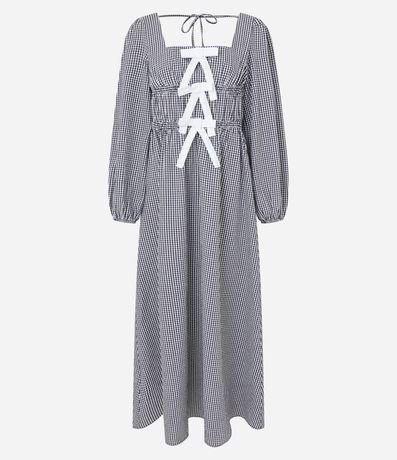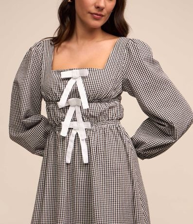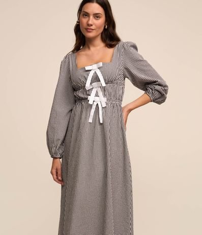 Ref: Vestido midi feminino, confeccionado em ana ruga, com decote quadrado, mangas longas bufantes, aplicação de laços frontais e estampa xadrez.