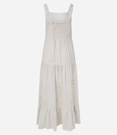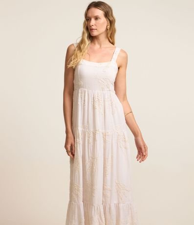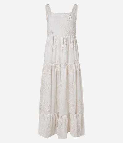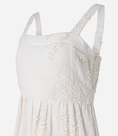 Ref: Vestido midi com alças largas, lastex nas costas, confeccionado em cambraia com bordado floral e babado na saia.
