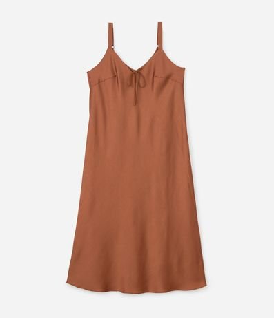 Vestido midi e sem mangas, confeccionado em cetim, com decote V com amarração e recorte vertical, além de alcinhas finas com regulador. Este produto foi fabricado através de processos mais sustentáveis, adotando boas práticas ambientais.