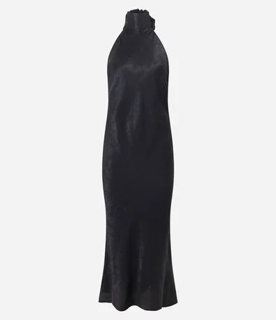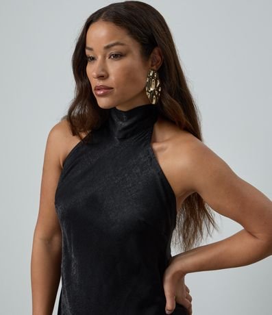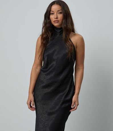Vestido feminino em cetim com brilho sofisticado e caimento elegante. Possui modelagem midi ajustada ao corpo, frente única com gola halter e amarração nas costas. Ideal para festas e happy hours, valorizando produções noturnas com charme e presença marcante.