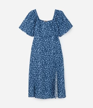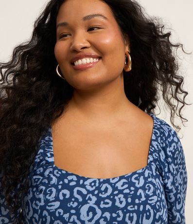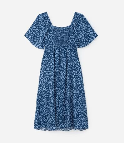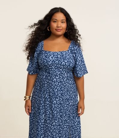 Ref: Vestido plus size, comprimento midi, confeccionado em chalis de viscose mais sustentável através de boas práticas ambientais. A peça possui decote quadrado tanto no busto quanto nas costas, além de lastex dianteiro e mangas curtas amplas. Estampado com animal print de onça