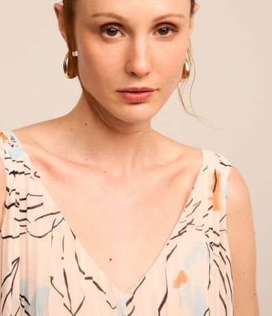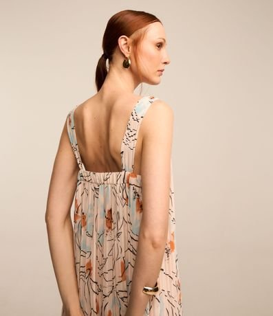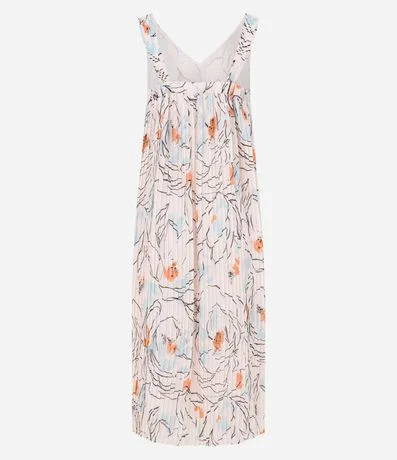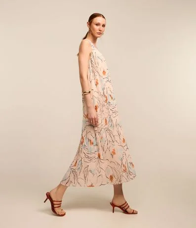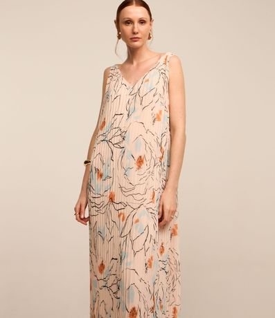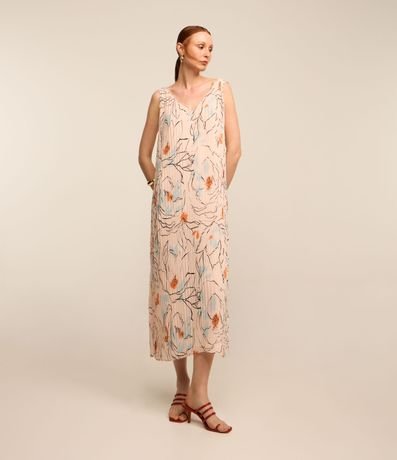 Ref: Vestido midi feminino, confeccionado em chiffon, com decote V, alças médias, textura drapeada e estampa floral.