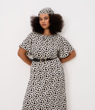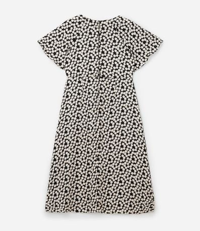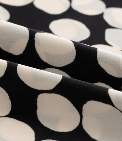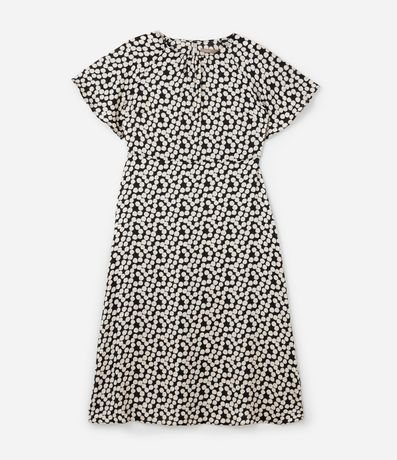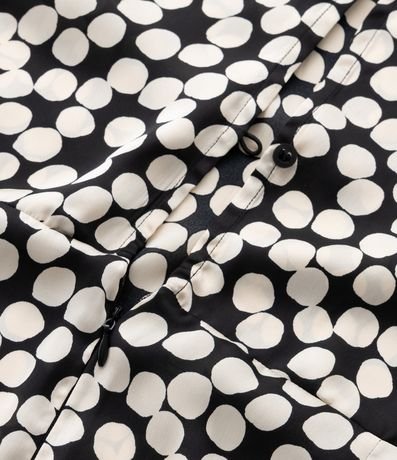 Ref: Vestido midi confeccionado em crepe com estampa de bolinhas e efeito acetinado. A peça tem gola redonda com preguinhas e mangas curtas evasê.