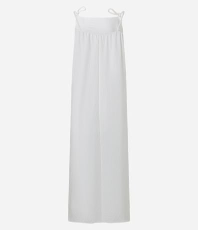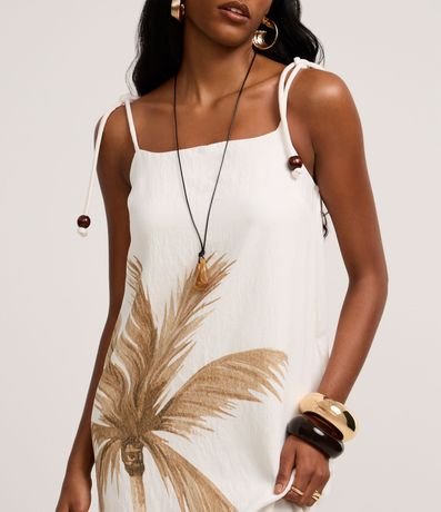 Ref: Vestido evasê midi de alças finas de cordões com miçangas, confeccionado em crepe, com decote reto e estampa de coqueiros. Peça com forro. Este produto possui viscose certificada em sua composição, sendo ambientalmente mais responsável.