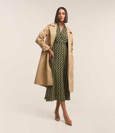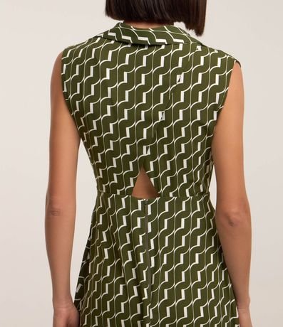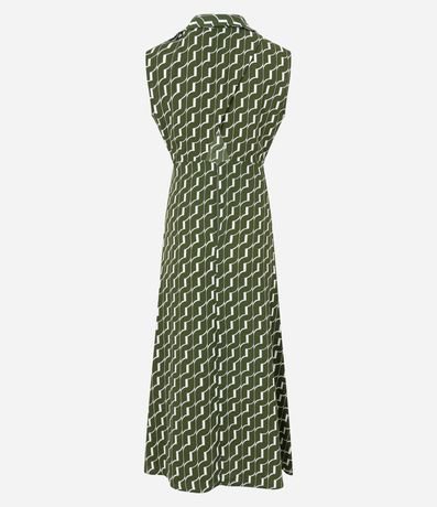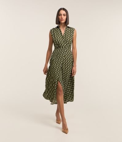 Ref: Vestido midi feminino, confeccionado em crepe, com gola lapela, sem mangas, cintura marcada e estampa geométrica.