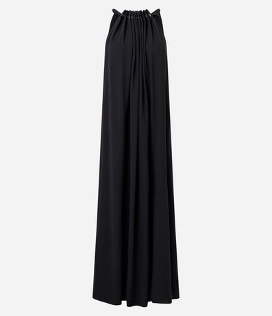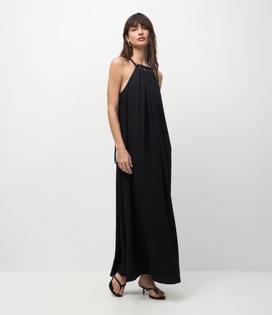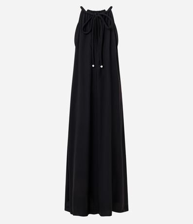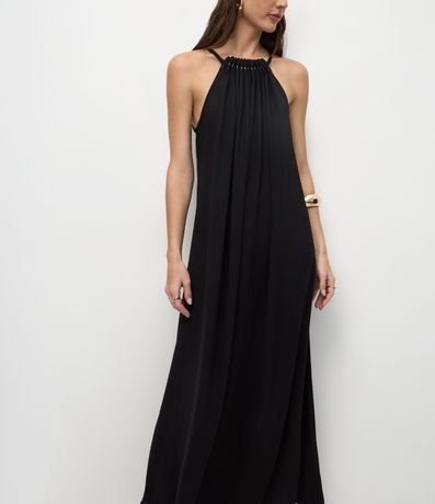 Ref: Vestido feminino midi em crepe, modelo sem mangas com decote halterneck ajustável por amarração. Apresenta franzido frontal e caimento fluido ao longo do corpo.
