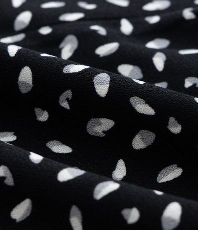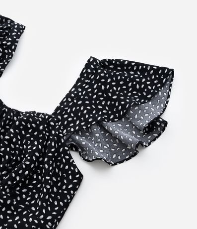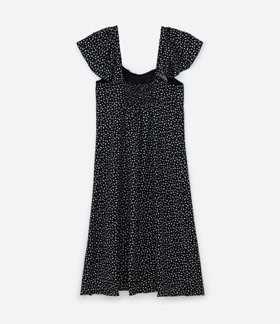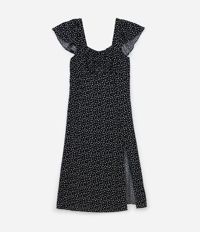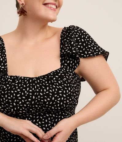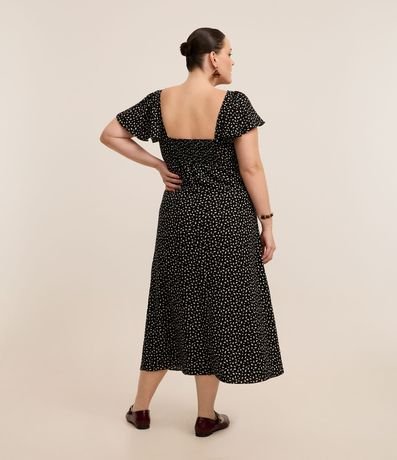 Ref: Vestido plus size de comprimento midi, sem mangas, confeccionado em crepe e com padronagem poá em pintinhas. Possui busto franzido, babados nos ombros, lastex nas costas e fenda frontal.