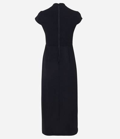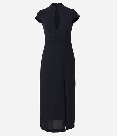 Ref: Vestido midi feminino, confeccionado em crepe, com gola japonesa, abertura no decote, mangas curtas e fenda na perna.