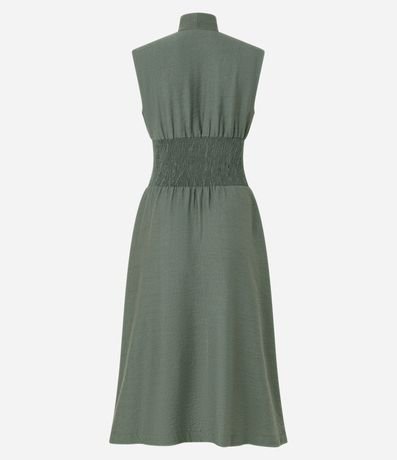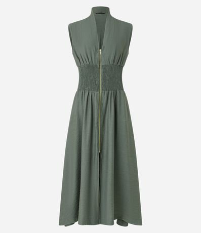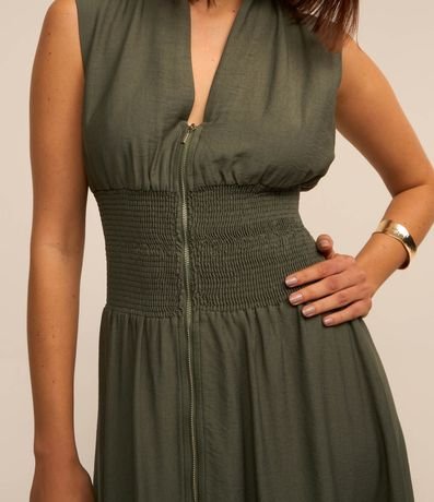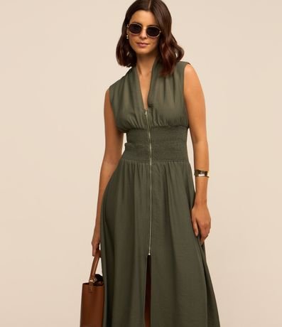 Ref: Vestido midi feminino, confeccionado em crepe, com zíper frontal, sem mangas, lastex na cintura e superfície sem estampa.