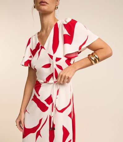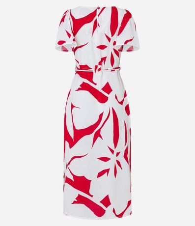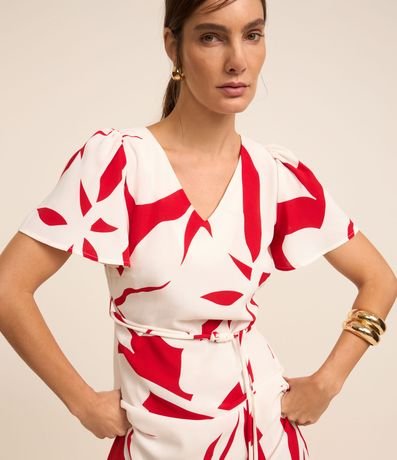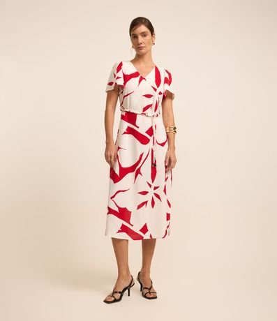Ref: Vestido feminino modelo midi, confeccionado com efeito airflow, que permite uma sensação amassadinha para o tecido. Decote em v e mangas curtas, peça contém cinto encapado na cintura e estampa floral.