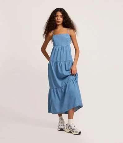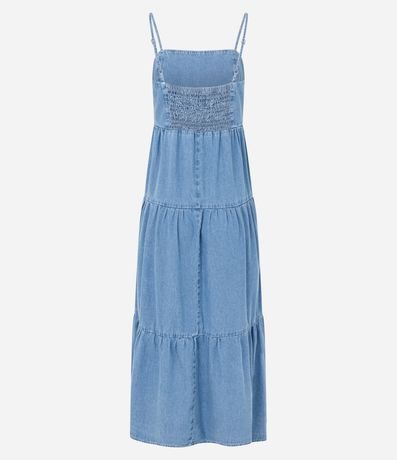 Ref: Vestido midi confeccionado em jeans com alcinhas finas e detalhe de marias, trazendo leveza e movimento ao visual. Possui busto com lastex para melhor ajuste e comprimento abaixo do joelho. Peça versátil para compor looks casuais, confeccionado em algodão de certificado BCI.
