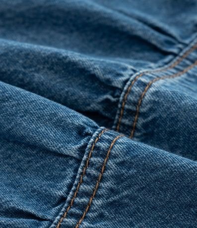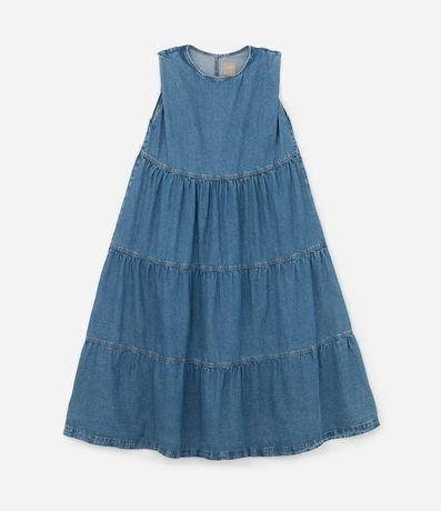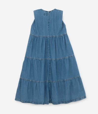 Vestido feminino Curve & Plus Size confeccionado em jeans de algodão certificado bci com boas práticas ambientais, peça no modelo midi, gola redonda, sem manga e babados.