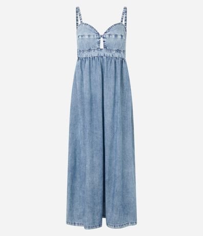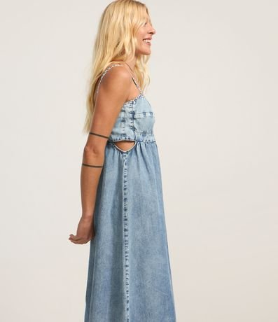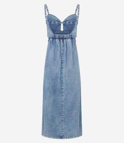 Ref: Vestido midi com alcinha fina, confeccionado em jeans com boas práticas ambientais, busto com recorte vazado e elástico nas costas.