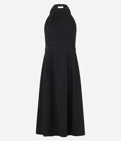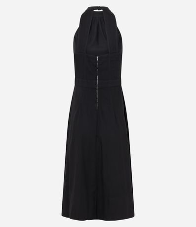 Ref: Vestido midi frente única, sem manga, confeccionado em jeans com algodão certificado bci e fechamento por zíper nas costas.
