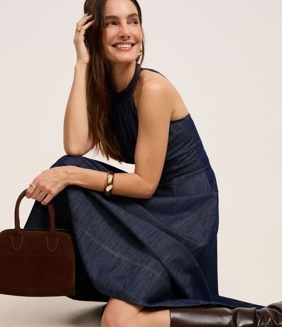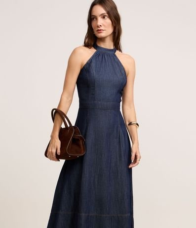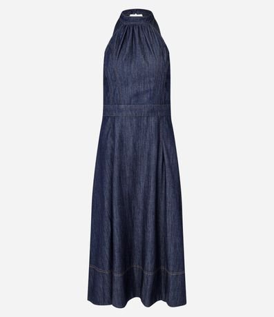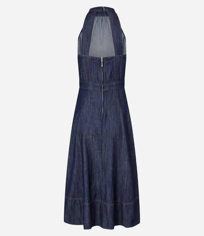 Vestido Midi em Jeans com Frente única e Costas Abertas