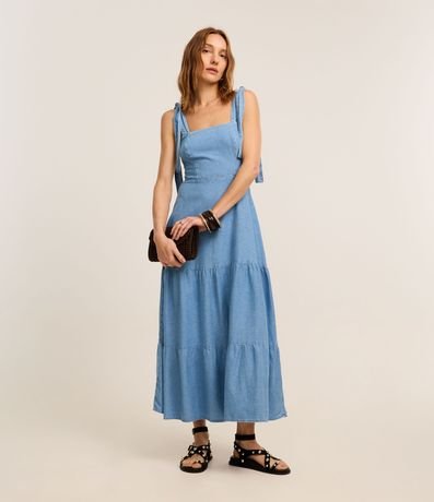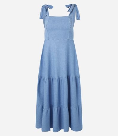 Ref: Vestido feminino confeccionado em jeans mais sustentável, no modelo midi, com decote reto, alças com laço e barra com babados.