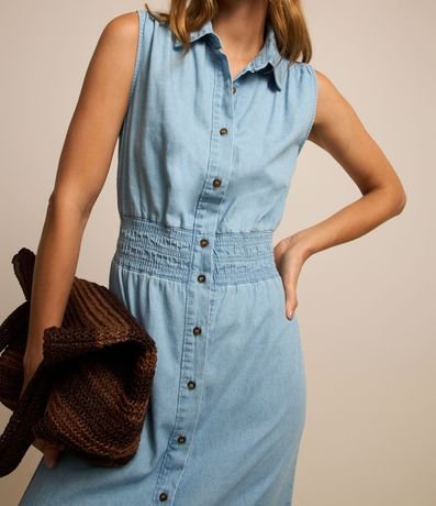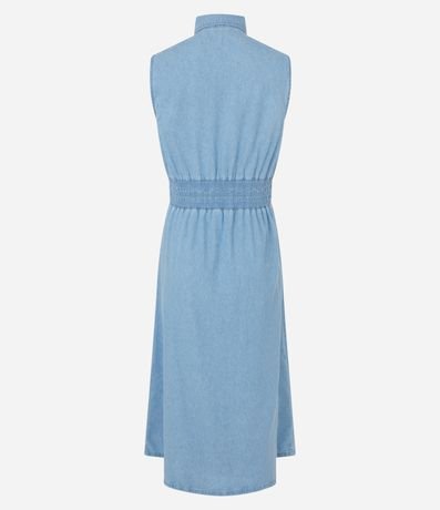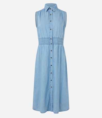 Ref: Vestido new midi com gola colarinho, sem mangas, confeccionado em jeans e com lastex na cintura.