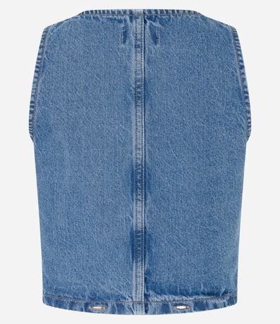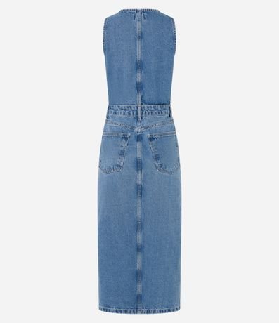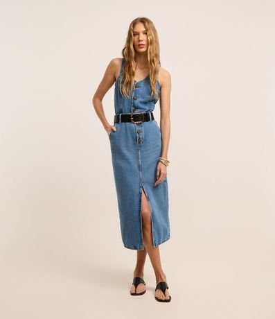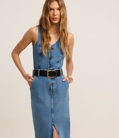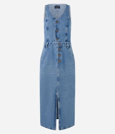 Ref: Vestido feminino em jeans de material mais sustentável em boas praticas ambientais. Peça no modelo midi sem manga, com decote em v e abotoamento frontal. Peça permite ao look uma aparência de peças separadas, na saia uma fenda frontal. Este produto possui algodão certificado BCI em sua composição, além de ter sido produzido através de processos mais sustentáveis, sendo ambientalmente mais responsável.