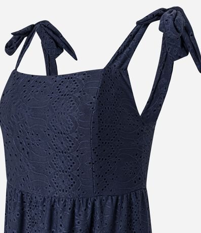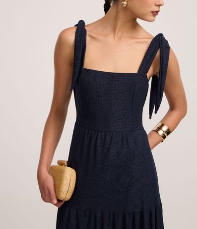 Ref: Vestido feminino de comprimento midi, com decote quadrado e alças médias com amarração nos ombros. Sem estampa, a peça confeccionada em laise possui textura floral com furinhos. Conta ainda com lastex nas costas e babados Marias na saia.